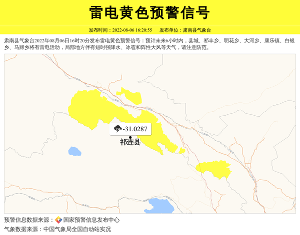 肃南县气象台2022年08月06日16时20分发布雷电黄色预警信号:预计未来6小时内,县城、祁丰乡、明花乡、大河乡、康乐镇、白银乡、马蹄乡将有雷电活动,局部地方伴有短时强降水、冰雹和阵性大风等天气,请注意防范。 信息来源:国家预警信息发布中心; 发布单位:肃南县气象台。