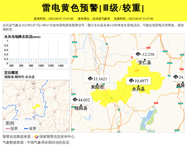 永兴县气象台2022年8月7日15时47分发布雷电黄色预警信号:预计永兴县未来6小时将发生雷电活动,可能出现雷电灾害事故,请加强防范。 信息来源:国家预警信息发布中心; 发布单位:永兴县气象局。