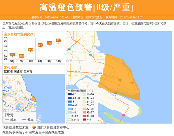 启东市气象台2022年08月06日10时20分继续发布高温橙色预警信号:预计今天白天我市各镇、园区、街道最高气温将升至37℃以上,请注意防范。 信息来源:国家预警信息发布中心; 发布单位:启东市气象台。