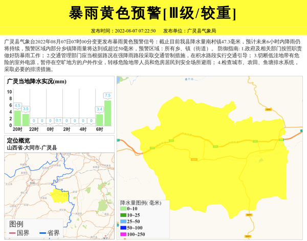 广灵县气象台2022年08月07日07时00分变更发布暴雨黄色预警信号:截止目前我县降水量南村镇47.3毫米,预计未来6小时内降雨仍将持续,预警区域内部分乡镇降雨量将达到或超过50毫米,预警区域:所有乡、镇(街道)。 防御指南: 1.政府及相关部门按照职责做好防暴雨工作; 2.交通管理部门应当根据路况在强降雨路段采取交通管制措施,在积水路段实行交通引导; 3.切断低洼地带有危险的室外电源,暂停在空旷地方的户外作业,转移危险地带人员和危房居民到安全场所避雨; 4.检查城市、农田、鱼塘排水系统,采取必要的排涝措施。 信息来源:国家预警信息发布中心; 发布单位:广灵县气象局。