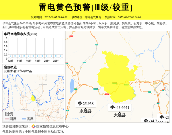 华坪县气象台2022年8月7日0时06分发布雷电黄色预警信号:预计未来6小时,永兴乡、船房乡、兴泉镇、石龙坝、中心镇、荣将镇、新庄乡和通达乡将有雷电活动,可能造成雷击灾害,并会伴有短时强降水、雷暴大风和冰雹,请注意加强防范。 信息来源:国家预警信息发布中心; 发布单位:华坪县气象台。