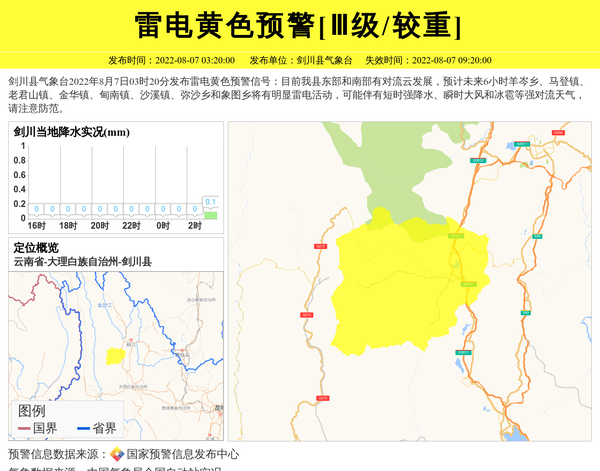 剑川县气象台2022年8月7日03时20分发布雷电黄色预警信号:目前我县东部和南部有对流云发展,预计未来6小时羊岑乡、马登镇、老君山镇、金华镇、甸南镇、沙溪镇、弥沙乡和象图乡将有明显雷电活动,可能伴有短时强降水、瞬时大风和冰雹等强对流天气,请注意防范。 信息来源:国家预警信息发布中心; 发布单位:剑川县气象台。
