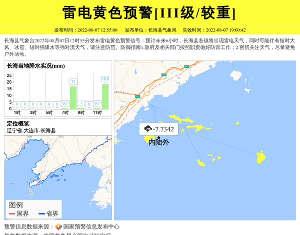 长海县气象台2022年08月07日12时55分发布雷电黄色预警信号:预计未来6小时,长海县各镇将出现雷电天气,同时可能伴有短时大风、冰雹、短时强降水等强对流天气,请注意防范。防御指南1.政府及相关部门按照职责做好防雷工作;2.密切关注天气,尽量避免户外活动。 信息来源:国家预警信息发布中心; 发布单位:长海县气象局。