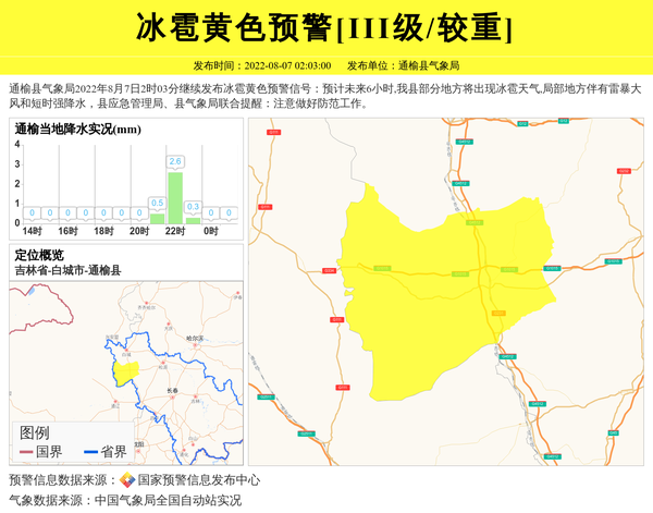 通榆县气象局2022年8月7日2时03分继续发布冰雹黄色预警信号:预计未来6小时,我县部分地方将出现冰雹天气,局部地方伴有雷暴大风和短时强降水,县应急管理局、县气象局联合提醒:注意做好防范工作。 信息来源:国家预警信息发布中心; 发布单位:通榆县气象局。