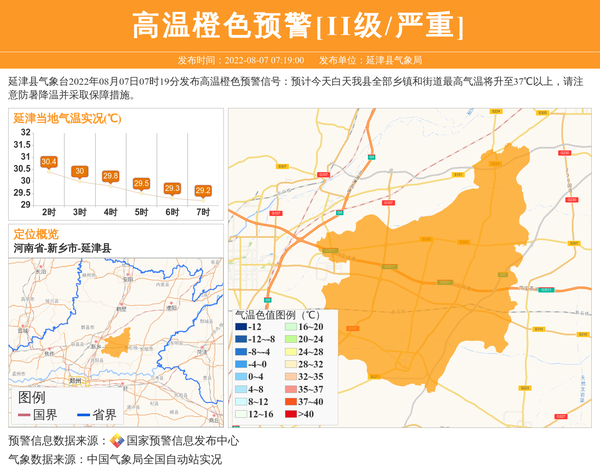 延津县气象台2022年08月07日07时19分发布高温橙色预警信号:预计今天白天我县全部乡镇和街道最高气温将升至37℃以上,请注意防暑降温并采取保障措施。 信息来源:国家预警信息发布中心; 发布单位:延津县气象局。