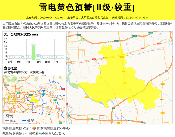 大厂回族自治县气象台2022年08月06日19时02分发布雷电黄色预警信号:预计未来6小时内,我县各镇将出现雷阵雨天气,雷雨时伴有短时强降水、短时大风等强对流天气,请有关单位和人员做好防范准备。 信息来源:国家预警信息发布中心; 发布单位:大厂回族自治县气象台。
