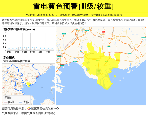 曹妃甸区气象台2022年08月06日06时05分发布雷电黄色预警信号:预计未来6小时,我区各场镇、园区和海面将有雷电活动,期间可能伴有短时强降水、短时大风等强对流天气,请相关单位和人员关注并防范! 信息来源:国家预警信息发布中心; 发布单位:曹妃甸区气象台。