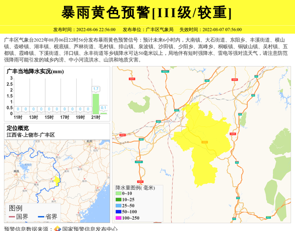 广丰区气象台2022年08月06日22时56分发布暴雨黄色预警信号:预计未来6小时内,大南镇、大石街道、东阳乡、丰溪街道、横山镇、壶峤镇、湖丰镇、枧底镇、芦林街道、毛村镇、排山镇、泉波镇、沙田镇、少阳乡、嵩峰乡、桐畈镇、铜钹山镇、吴村镇、五都镇、霞峰镇、下溪街道、洋口镇、永丰街道等乡镇降水可达50毫米以上,局地伴有短时强降水、雷电等强对流天气,请注意防范强降雨可能引发的城乡内涝、中小河流洪水、山洪和地质灾害。 信息来源:国家预警信息发布中心; 发布单位:广丰区气象局。