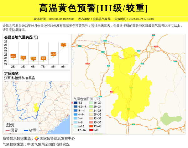 会昌县气象台2022年08月06日09时52分发布高温黄色预警信号:预计未来三天,全县各乡镇的部分地区日最高气温将达35°C以上,请注意防暑降温。 信息来源:国家预警信息发布中心; 发布单位:会昌县气象局。