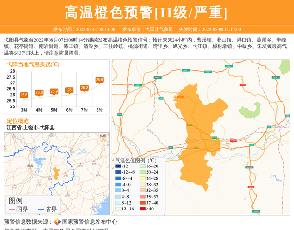 弋阳县气象台2022年08月07日08时14分继续发布高温橙色预警信号:预计未来24小时内,曹溪镇、叠山镇、港口镇、葛溪乡、圭峰镇、花亭街道、南岩街道、漆工镇、清湖乡、三县岭镇、桃源街道、湾里乡、旭光乡、弋江镇、樟树墩镇、中畈乡、朱坑镇最高气温将达37°C以上,请注意防暑降温。 信息来源:国家预警信息发布中心; 发布单位:弋阳县气象局。