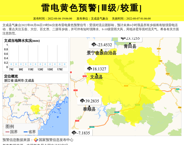 文成县气象台2022年08月06日19时06分发布雷电黄色预警信号:受强对流云团影响,预计未来6小时我县所有乡镇将有较强雷电活动,重点关注玉壶、大峃、百丈漈、二源等乡镇,并可伴有短时强降水、8-10级雷雨大风,局地冰雹等强对流天气。希各有关方面注意防范。 信息来源:国家预警信息发布中心; 发布单位:文成县气象台。