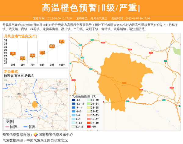 丹凤县气象台2022年08月06日10时17分升级发布高温橙色预警信号:预计下述地区未来24小时内最高气温将升至37℃以上:竹林关镇、武关镇、商镇、棣花镇、龙驹寨街道、蔡川镇、土门镇、花瓶子镇、寺坪镇、铁峪铺镇,请注意防范。 信息来源:国家预警信息发布中心; 发布单位:丹凤县气象台。