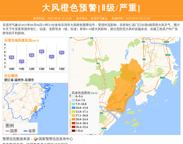 乐清市气象台2022年08月06日15时22分发布乐清市大风橙色预警信号:受强对流影响,目前智仁昌门已出现8级雷雨大风天气,预计今天下午至夜里我市智仁、仙溪、龙西等乡(镇、街道)将有8-10级大风影响,请注意防范大风对设施农业、在建工程及户外广告牌等的不利影响。 信息来源:国家预警信息发布中心; 发布单位:乐清市气象台。