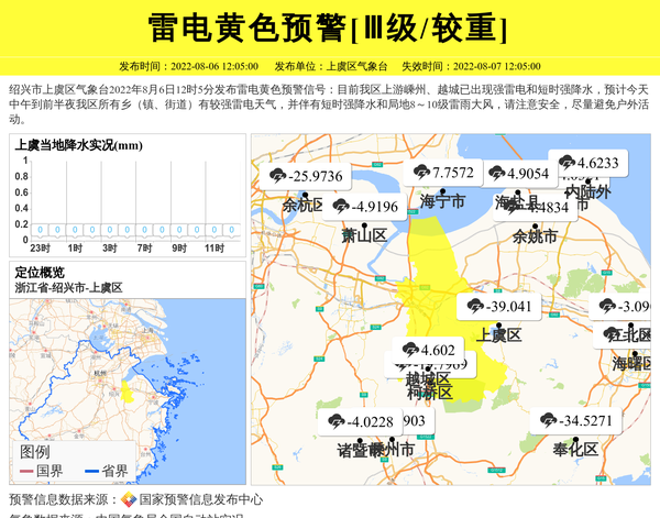 绍兴市上虞区气象台2022年8月6日12时5分发布雷电黄色预警信号:目前我区上游嵊州、越城已出现强雷电和短时强降水,预计今天中午到前半夜我区所有乡(镇、街道)有较强雷电天气,并伴有短时强降水和局地8~10级雷雨大风,请注意安全,尽量避免户外活动。 信息来源:国家预警信息发布中心; 发布单位:上虞区气象台。