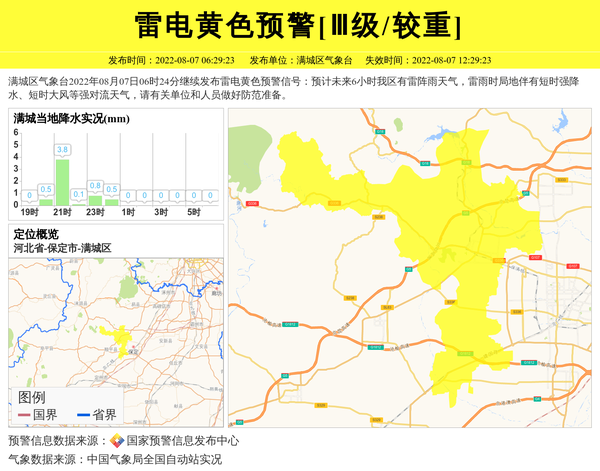 满城区气象台2022年08月07日06时24分继续发布雷电黄色预警信号:预计未来6小时我区有雷阵雨天气,雷雨时局地伴有短时强降水、短时大风等强对流天气,请有关单位和人员做好防范准备。 信息来源:国家预警信息发布中心; 发布单位:满城区气象台。