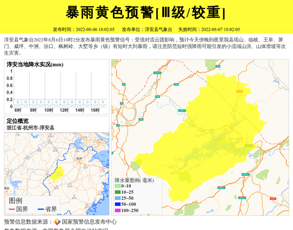 淳安县气象台2022年8月6日18时2分发布暴雨黄色预警信号:受强对流云团影响,预计今天傍晚到夜里我县瑶山、临岐、王阜、屏门、威坪、中洲、汾口、枫树岭、大墅等乡(镇)有短时大到暴雨,请注意防范短时强降雨可能引发的小流域山洪、山体滑坡等次生灾害。 信息来源:国家预警信息发布中心; 发布单位:淳安县气象台。