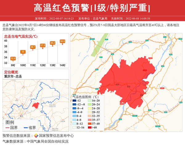 忠县气象局发布高温红色预警[Ⅰ级/特别严重] 相关文章