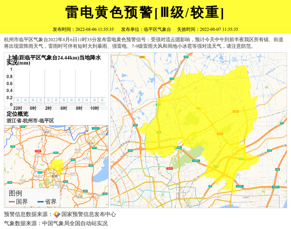 杭州市临平区气象台2022年8月6日11时35分发布雷电黄色预警信号:受强对流云团影响,预计今天中午到前半夜我区所有镇、街道将出现雷阵雨天气,雷雨时可伴有短时大到暴雨、强雷电、7-9级雷雨大风和局地小冰雹等强对流天气,请注意防范。 信息来源:国家预警信息发布中心; 发布单位:临平区气象台。