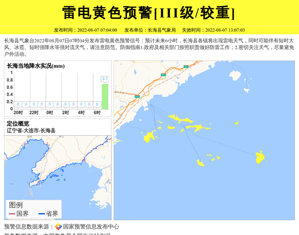 长海县气象台2022年08月07日07时04分发布雷电黄色预警信号:预计未来6小时,长海县各镇将出现雷电天气,同时可能伴有短时大风、冰雹、短时强降水等强对流天气,请注意防范。防御指南1.政府及相关部门按照职责做好防雷工作;2.密切关注天气,尽量避免户外活动。 信息来源:国家预警信息发布中心; 发布单位:长海县气象局。