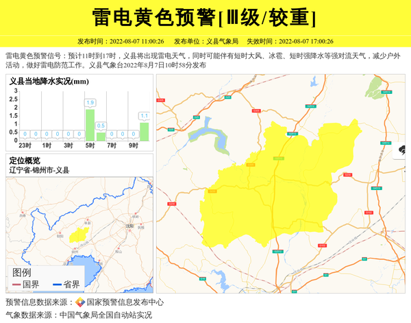 雷电黄色预警信号:预计11时到17时,义县将出现雷电天气,同时可能伴有短时大风、冰雹、短时强降水等强对流天气,减少户外活动,做好雷电防范工作。义县气象台2022年8月7日10时58分发布 信息来源:国家预警信息发布中心; 发布单位:义县气象局。