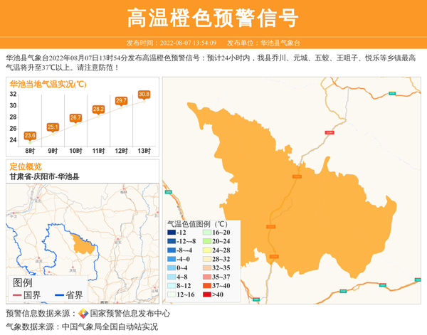华池县气象台2022年08月07日13时54分发布高温橙色预警信号:预计24小时内,我县乔川、元城、五蛟、王咀子、悦乐等乡镇最高气温将升至37℃以上。请注意防范! 信息来源:国家预警信息发布中心; 发布单位:华池县气象台。