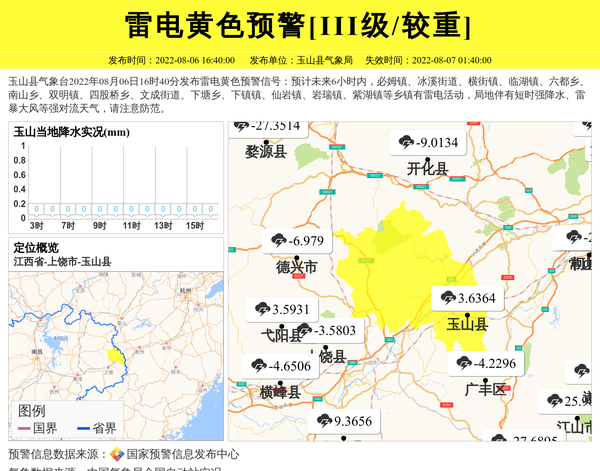 玉山县气象台2022年08月06日16时40分发布雷电黄色预警信号:预计未来6小时内,必姆镇、冰溪街道、横街镇、临湖镇、六都乡、南山乡、双明镇、四股桥乡、文成街道、下塘乡、下镇镇、仙岩镇、岩瑞镇、紫湖镇等乡镇有雷电活动,局地伴有短时强降水、雷暴大风等强对流天气,请注意防范。 信息来源:国家预警信息发布中心; 发布单位:玉山县气象局。