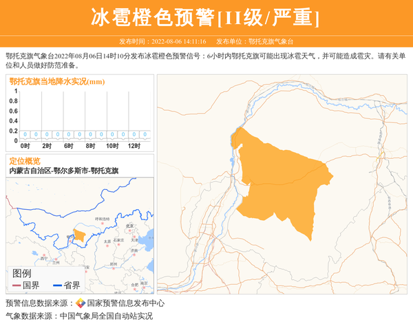 鄂托克旗气象台2022年08月06日14时10分发布冰雹橙色预警信号:6小时内鄂托克旗可能出现冰雹天气,并可能造成雹灾。请有关单位和人员做好防范准备。 信息来源:国家预警信息发布中心; 发布单位:鄂托克旗气象台。