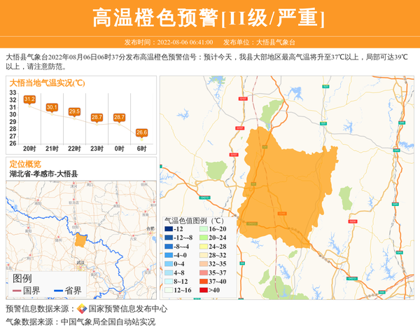 大悟县气象台2022年08月06日06时37分发布高温橙色预警信号:预计今天,我县大部地区最高气温将升至37℃以上,局部可达39℃以上,请注意防范。 信息来源:国家预警信息发布中心; 发布单位:大悟县气象台。