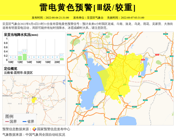 呈贡区气象台2022年8月6日21时31分发布雷电黄色预警信号:预计未来6小时我区龙城、斗南、洛龙、乌龙、雨花、吴家营、大渔街道将有明显雷电活动,局部可能伴有短时强降水、冰雹或瞬时大风,请注意防范。 信息来源:国家预警信息发布中心; 发布单位:呈贡区气象台。