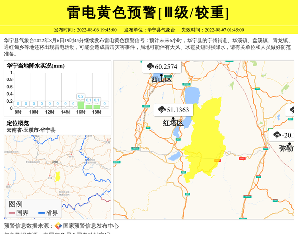 华宁县气象台2022年8月6日19时45分继续发布雷电黄色预警信号:预计未来6小时,华宁县的宁州街道、华溪镇、盘溪镇、青龙镇、通红甸乡等地还将出现雷电活动,可能会造成雷击灾害事件,局地可能伴有大风、冰雹及短时强降水,请有关单位和人员做好防范准备。 信息来源:国家预警信息发布中心; 发布单位:华宁县气象台。