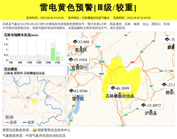 石林彝族自治县气象台发布雷电黄色预警[Ⅲ级/较重] 相关文章