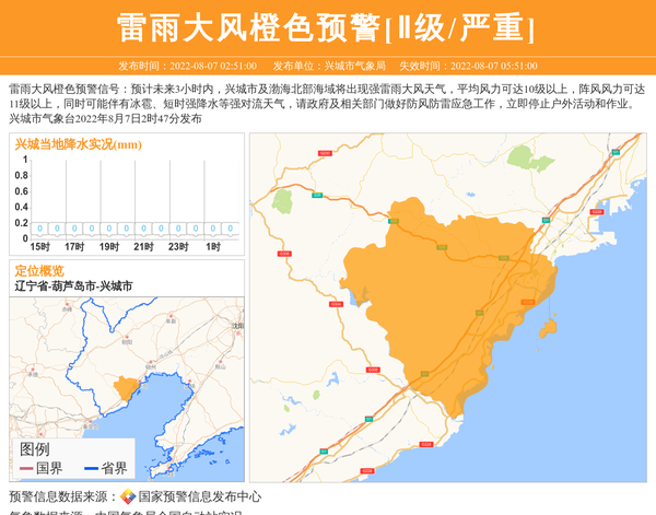 雷雨大风橙色预警信号:预计未来3小时内,兴城市及渤海北部海域将出现强雷雨大风天气,平均风力可达10级以上,阵风风力可达11级以上,同时可能伴有冰雹、短时强降水等强对流天气,请政府及相关部门做好防风防雷应急工作,立即停止户外活动和作业。兴城市气象台2022年8月7日2时47分发布 信息来源:国家预警信息发布中心; 发布单位:兴城市气象局。