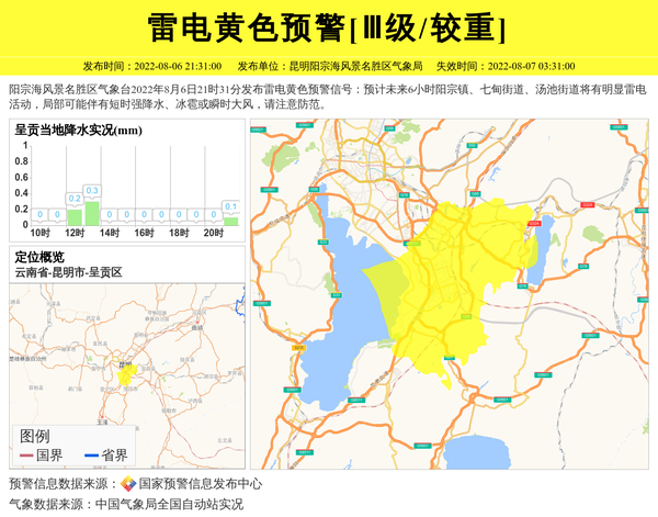 阳宗海风景名胜区气象台2022年8月6日21时31分发布雷电黄色预警信号:预计未来6小时阳宗镇、七甸街道、汤池街道将有明显雷电活动,局部可能伴有短时强降水、冰雹或瞬时大风,请注意防范。 信息来源:国家预警信息发布中心; 发布单位:昆明阳宗海风景名胜区气象局。