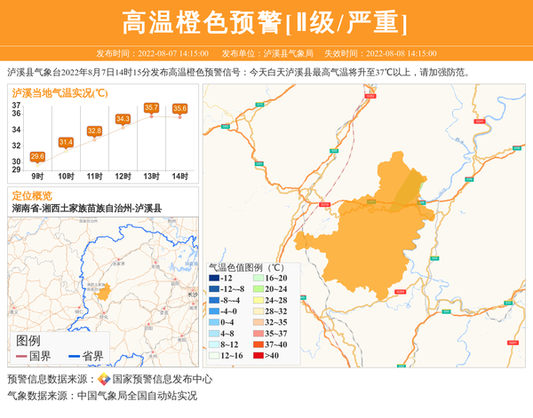 泸溪县气象台2022年8月7日14时15分发布高温橙色预警信号:今天白天泸溪县最高气温将升至37℃以上,请加强防范。 信息来源:国家预警信息发布中心; 发布单位:泸溪县气象局。