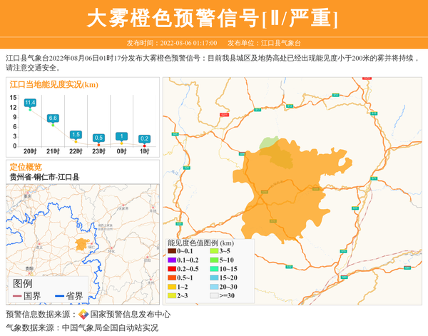 江口县气象台2022年08月06日01时17分发布大雾橙色预警信号:目前我县城区及地势高处已经出现能见度小于200米的雾并将持续,请注意交通安全。 信息来源:国家预警信息发布中心; 发布单位:江口县气象台。