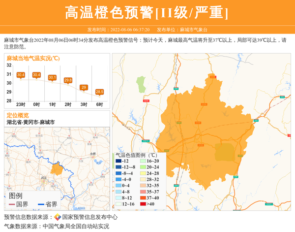 麻城市气象台2022年08月06日06时34分发布高温橙色预警信号:预计今天,麻城最高气温将升至37℃以上,局部可达39℃以上,请注意防范。 信息来源:国家预警信息发布中心; 发布单位:麻城市气象台。