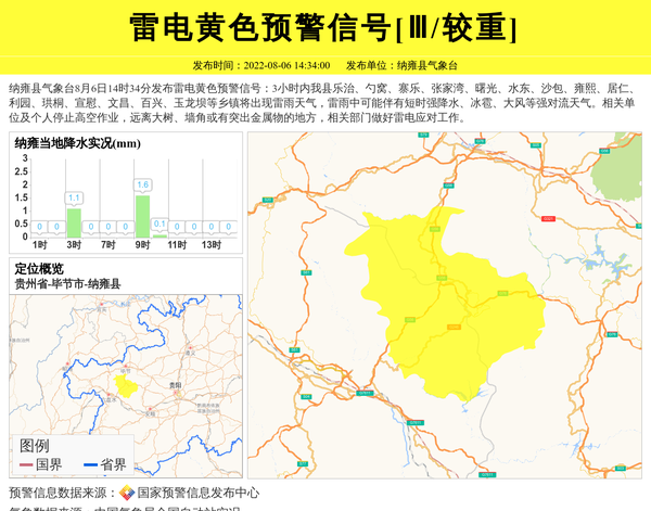 纳雍县气象台发布雷电黄色预警信号[Ⅲ/较重]