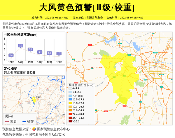 井陉县气象台2022年08月06日18时48分发布大风黄色预警信号:预计未来6小时井陉县全部乡镇、井陉矿区全部乡镇有短时大风,阵风风力达9级以上,请有关单位和人员做好防范准备。 信息来源:国家预警信息发布中心; 发布单位:井陉县气象台。