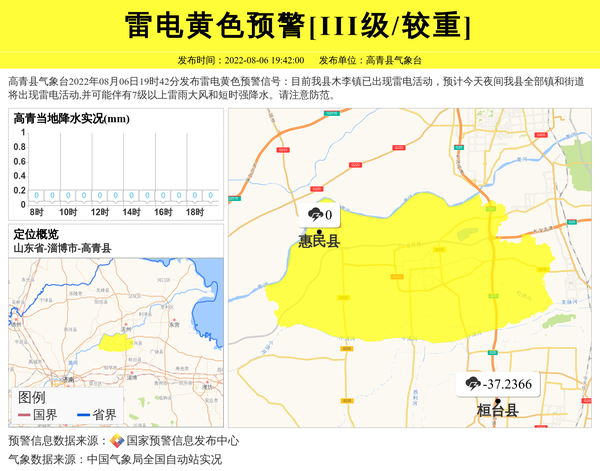 高青县气象台2022年08月06日19时42分发布雷电黄色预警信号:目前我县木李镇已出现雷电活动,预计今天夜间我县全部镇和街道将出现雷电活动,并可能伴有7级以上雷雨大风和短时强降水。请注意防范。 信息来源:国家预警信息发布中心; 发布单位:高青县气象台。