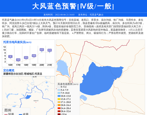 托里县气象台2022年8月6日21时34分发布大风蓝色预警信号:目前县城、老风口、库普乡、庙尔沟镇、铁厂沟镇、乌雪特乡、多拉特乡、阿克别里斗乡已出现7级以上大风天气。预计今天夜间至明日白天,我县普遍有5到6级偏西风,庙尔沟、多拉特风力6到7级,铁厂沟、老风口风区一线风力7-8级,阵风9级,需提前做好各项防范工作。防御指南1.政府及相关部门按照职责做好防大风工作;2.关好门窗,加固围板、棚架、广告牌等易被风吹动的搭建物,妥善安置易受大风影响的室外物品,遮盖建筑物资;3.行人注意尽量少骑自行车,刮风时不要在广告牌、临时搭建物等下面逗留。4.严禁野炊、烤火、吸烟等行为;严禁在野外烧荒、焚烧秸秆及烧灰积肥。 信息来源:国家预警信息发布中心; 发布单位:托里县气象台。