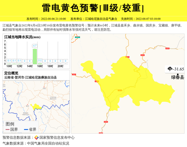 江城哈尼族自治县气象台发布雷电黄色预警[Ⅲ级/较重] 相关文章