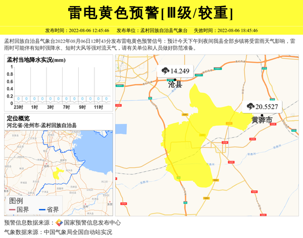 孟村回族自治县气象台2022年08月06日12时43分发布雷电黄色预警信号:预计今天下午到夜间我县全部乡镇将受雷雨天气影响,雷雨时可能伴有短时强降水、短时大风等强对流天气,请有关单位和人员做好防范准备。 信息来源:国家预警信息发布中心; 发布单位:孟村回族自治县气象台。