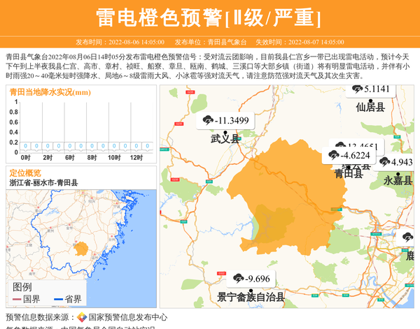 青田县气象台2022年08月06日14时05分发布雷电橙色预警信号:受对流云团影响,目前我县仁宫乡一带已出现雷电活动,预计今天下午到上半夜我县仁宫、高市、章村、祯旺、船寮、章旦、瓯南、鹤城、三溪口等大部乡镇(街道)将有明显雷电活动,并伴有小时雨强20~40毫米短时强降水、局地6~8级雷雨大风、小冰雹等强对流天气,请注意防范强对流天气及其次生灾害。 信息来源:国家预警信息发布中心; 发布单位:青田县气象台。
