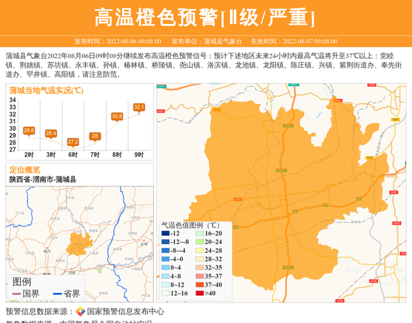 蒲城县气象台2022年08月06日09时08分继续发布高温橙色预警信号:预计下述地区未来24小时内最高气温将升至37℃以上:党睦镇、荆姚镇、苏坊镇、永丰镇、孙镇、椿林镇、桥陵镇、尧山镇、洛滨镇、龙池镇、龙阳镇、陈庄镇、兴镇、紫荆街道办、奉先街道办、罕井镇、高阳镇,请注意防范。 信息来源:国家预警信息发布中心; 发布单位:蒲城县气象台。