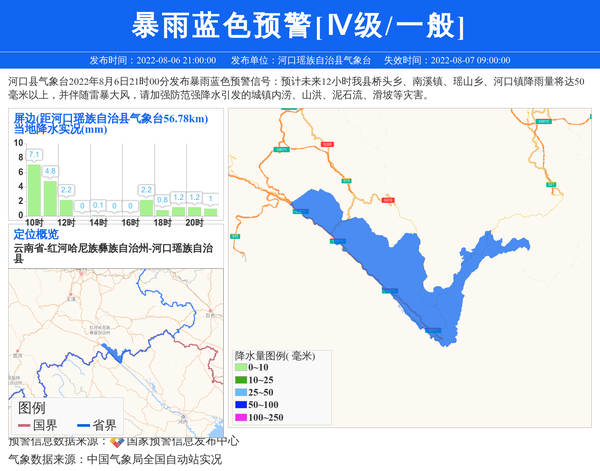 河口县气象台2022年8月6日21时00分发布暴雨蓝色预警信号:预计未来12小时我县桥头乡、南溪镇、瑶山乡、河口镇降雨量将达50毫米以上,并伴随雷暴大风,请加强防范强降水引发的城镇内涝、山洪、泥石流、滑坡等灾害。 信息来源:国家预警信息发布中心; 发布单位:河口瑶族自治县气象台。