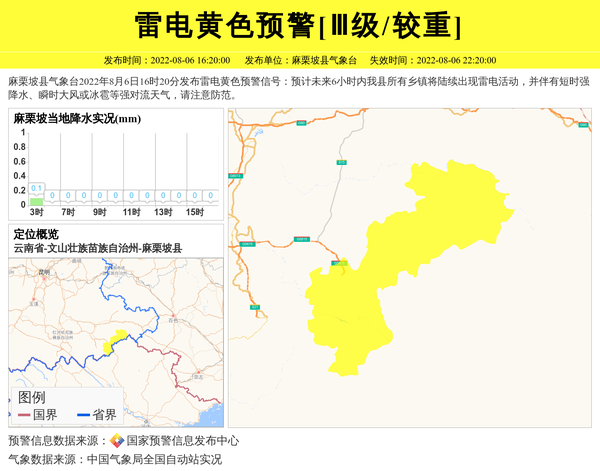 麻栗坡县气象台2022年8月6日16时20分发布雷电黄色预警信号:预计未来6小时内我县所有乡镇将陆续出现雷电活动,并伴有短时强降水、瞬时大风或冰雹等强对流天气,请注意防范。 信息来源:国家预警信息发布中心; 发布单位:麻栗坡县气象台。