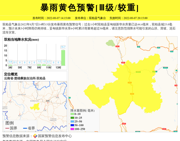 双柏县气象台2022年8月7日14时15分发布暴雨黄色预警信号:过去1小时双柏县妥甸镇新华水库量已达44.4毫米,双柏县城25.0毫米,预计未来5小时降雨仍将持续,妥甸镇新华水库6小时累计雨量将超过50毫米,请注意防范强降水可能引发的山洪、滑坡、泥石流等灾害。 信息来源:国家预警信息发布中心; 发布单位:双柏县气象台。