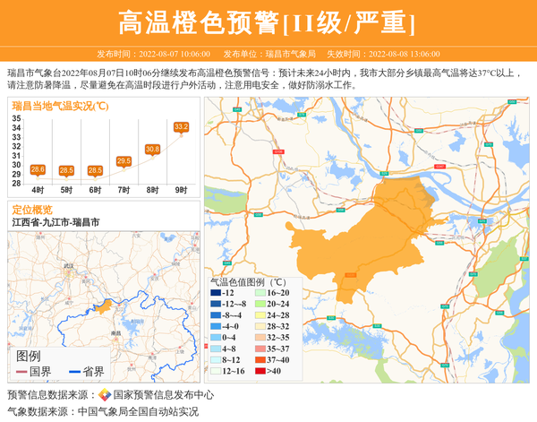 瑞昌市气象台2022年08月07日10时06分继续发布高温橙色预警信号:预计未来24小时内,我市大部分乡镇最高气温将达37°C以上,请注意防暑降温,尽量避免在高温时段进行户外活动,注意用电安全,做好防溺水工作。 信息来源:国家预警信息发布中心; 发布单位:瑞昌市气象局。