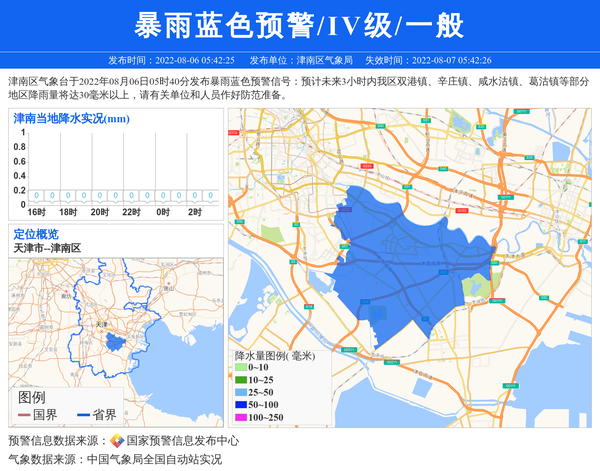 津南区气象台于2022年08月06日05时40分发布暴雨蓝色预警信号:预计未来3小时内我区双港镇、辛庄镇、咸水沽镇、葛沽镇等部分地区降雨量将达30毫米以上,请有关单位和人员作好防范准备。 信息来源:国家预警信息发布中心; 发布单位:津南区气象局。