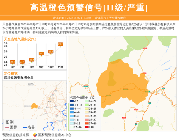 天全县气象台2022年08月07日11时50分对2022年08月05日12时30分发布的高温橙色预警信号进行第2次确认:预计我县所有乡镇未来24小时内最高气温将升至35℃以上。请有关部门和单位做好防御高温工作,户外露天作业的人员应采取防暑降温措施,午后高温时段尽量避免户外活动,特别注意老弱病幼人群的防暑降温。 信息来源:国家预警信息发布中心; 发布单位:天全县气象台。